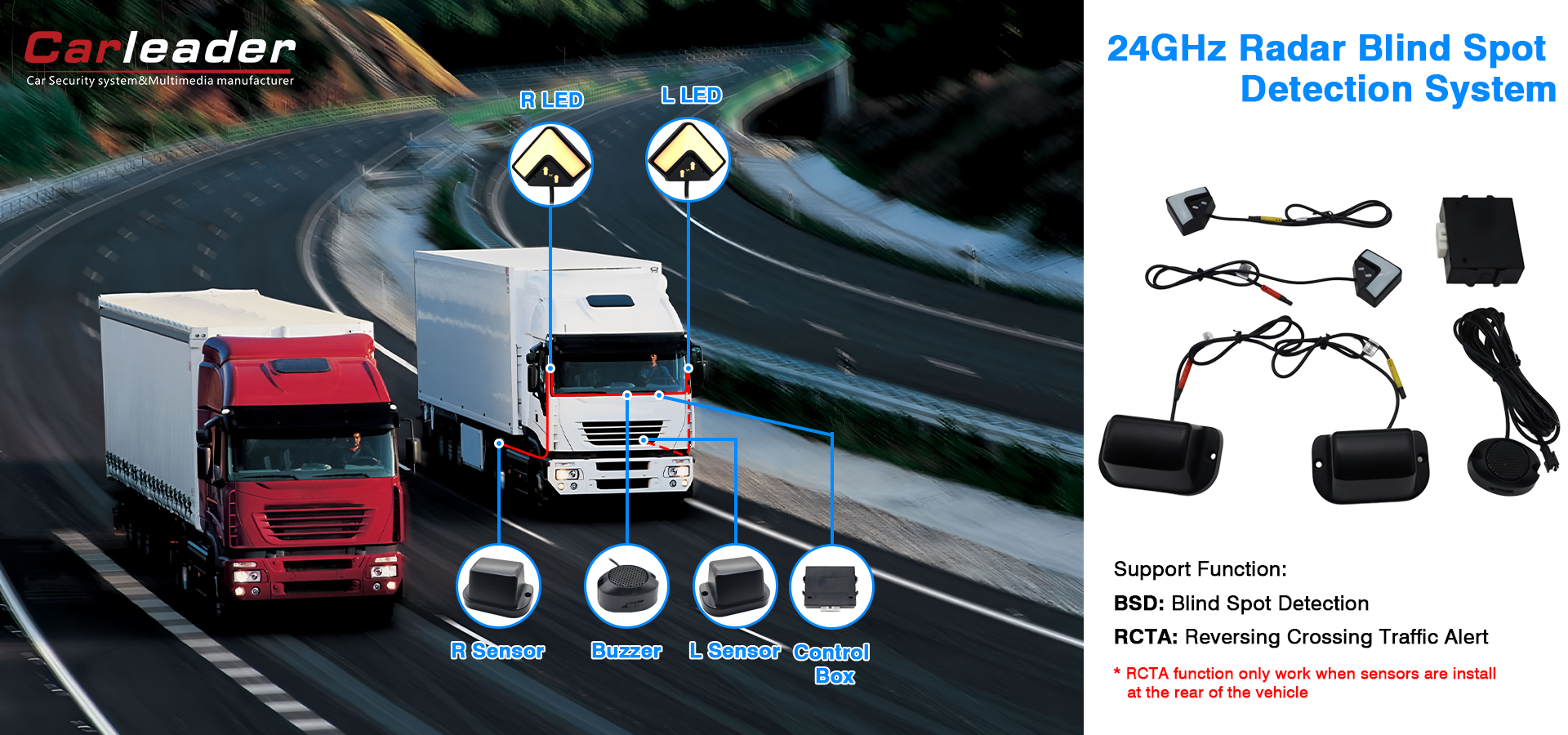 Córas Braite Spota Dall 24GHz Milliméadar BSD W.feidhm rcta. Agus an luas coibhneasta idir an carr agus an rud taobh thiar den charr á aisiompú, is mó an luas coibhneasta idir an carr agus an t -uafás, beidh an LED ag splancadh agus beidh an dordánaí ag aláram. Má theastaíonn lámhleabhar úsáideora an Chórais Braite Spota Braite 24GHz agus tuilleadh eolais uait, bíodh leisce ort fiosrúchán a chur chugainn!