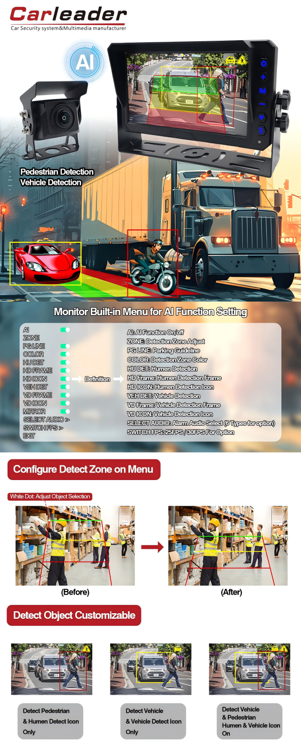 Monatóireacht ar Thiománaí AHD Ceamara Amharc I gCábánTacaíocht Córas Monatóireachta Braite Spota Dall Carleader 7 Inch AI BSD Tá Calabrú AI deartha le halgartaim ardchruinneas AI chun cinn agus oibriú roghchlár cz atá éasca le húsáid. Soláthraíonn an córas ceamara AI seo rabhaidh dinimiciúla uile-aimsire, ardchruinneas do choisithe agus d'fheithiclí do thiománaithe, rud a laghdóidh an baol timpistí tráchta go héifeachtach. Tá córas ceamara monatóireachta AI oiriúnach do charranna príobháideacha, cabhlaigh tráchtála agus feithiclí speisialta. Tá comhtháthú láidir agus comhoiriúnacht, marthanacht agus cumais monatóireachta fíor-ama ag an gcóras cabhlach AI.