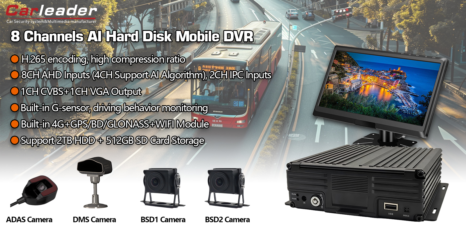 CarleaderTacaíocht DVR Soghluaiste 8CH AI HDD ADAS+DMS+BSDIs é an réiteach foirfe do loingis tráchtála, iompar poiblí, lóistíocht, agus feithiclí speisialta a éilíonn: