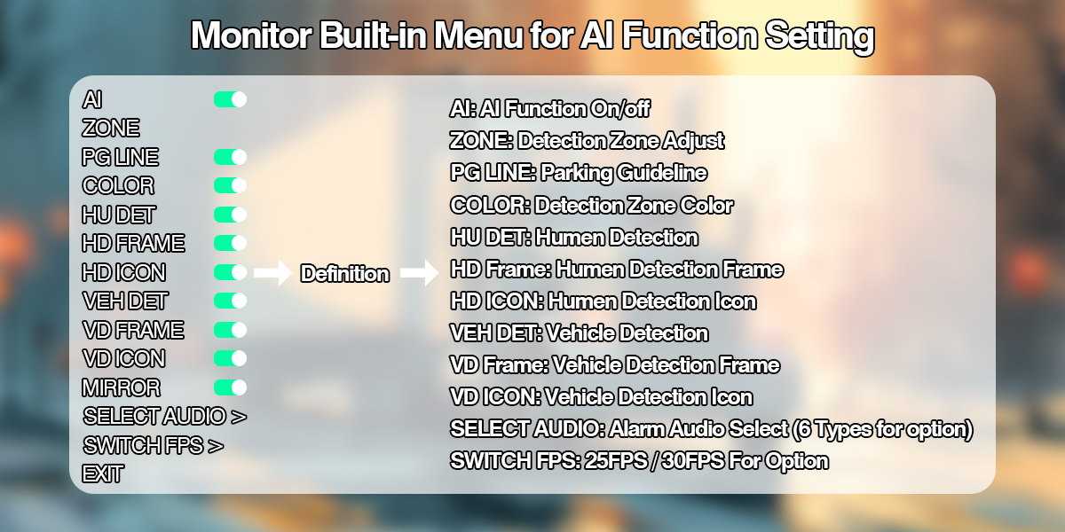 CarleaderTacaíonn Córas Monatóireachta Braite Spota Dall 7 Inch AI BSD le Calabrú AI, réiteach ceamara AI a thacaíonn le braite coisithe, braite feithicle, a mhéadaíonn go mór an tsábháilteacht agus tú ag tiomáint, monatóireacht a dhéanamh le roghchlár calabraithe AI ionsuite, ligean don úsáideoir an limistéar braite a choigeartú, dath an chrios braite a thaispeáint ar / as, cineál fuaime aláraim, taispeáint deilbhín feithicle agus coisithe, roghnú réad braite, etc.