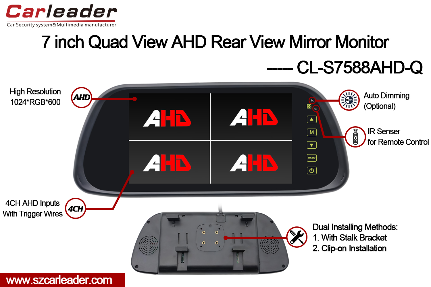 Uasghrádú ar anCarleaderTacaíocht 7 Inch 4CH Quad AHD Rear View Mirror Scáthán Monatóireacht a dhéanamh ar Suiteáil Dualar mhaithe le hinfheictheacht gan sárú, iontaofacht agus suaimhneas intinne ar an mbóthar.