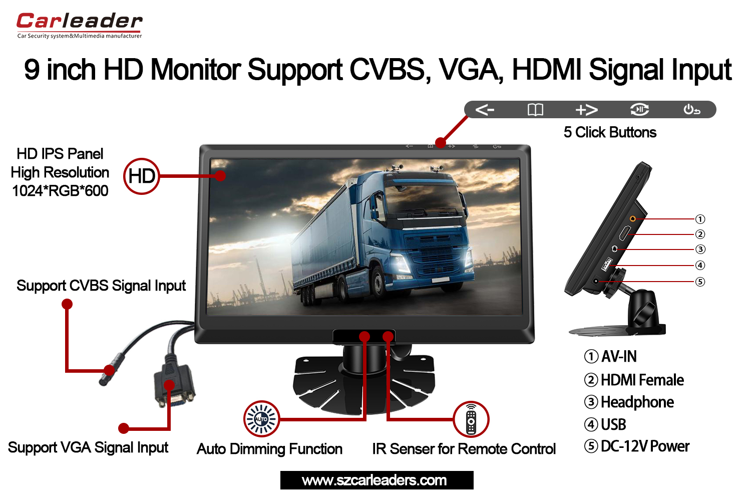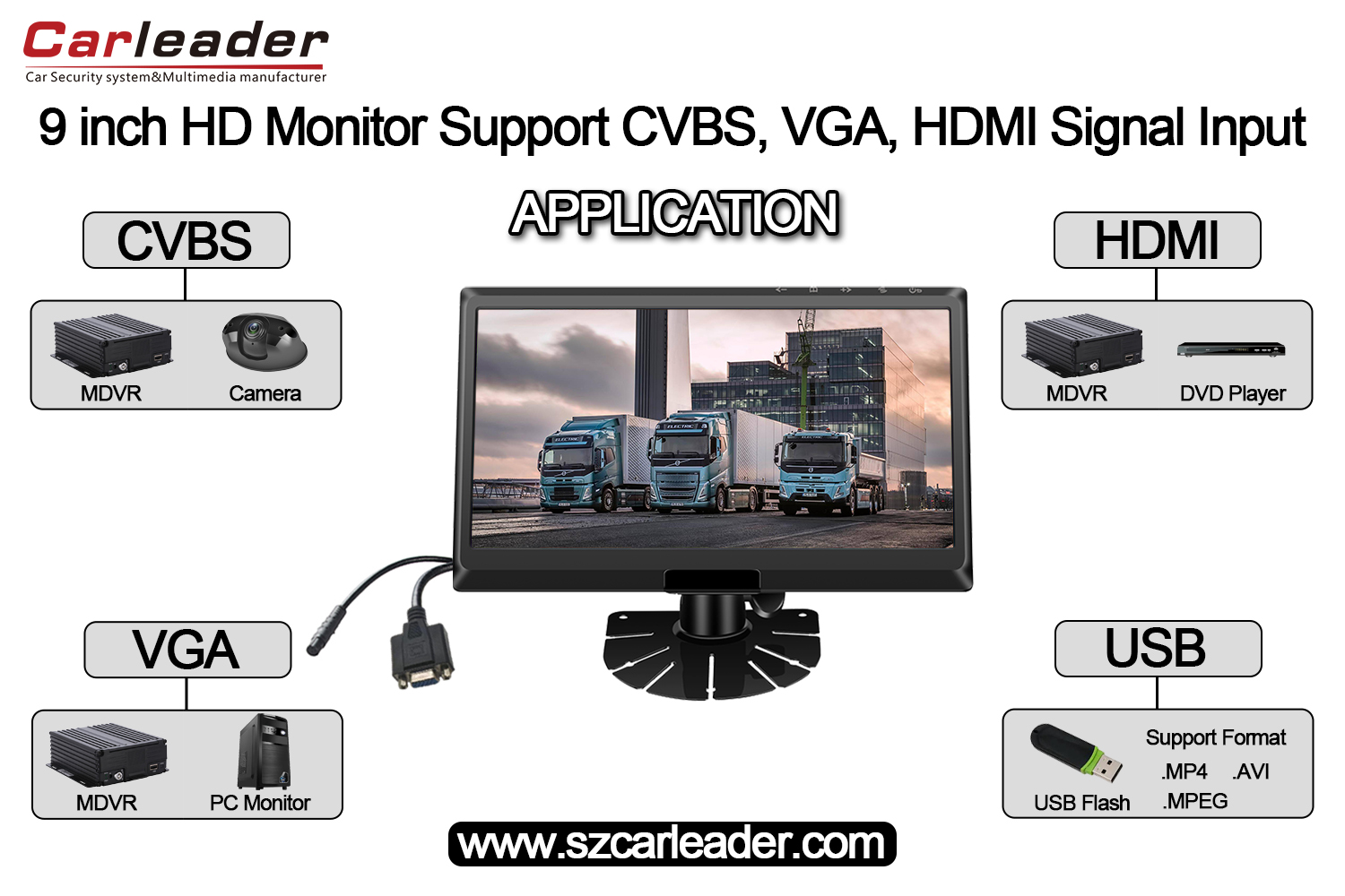 CarleaderMonatóireacht a dhéanamh ar 9 Orlach IPS Scáileán HD Tacaigh le Ionchuir CVBS+HD+VGAis monatóir HD ardfheidhmíochta é atá deartha le haghaidh monatóireachta feithiclí agus bainistiú cabhlaigh MDVR. Tacaíonn an monatóir Gluaisteán le hionchuir comhartha CVBS, HD agus VGA. Agus má tá comhéadan VGA nó HD ag an MDVR, is féidir é a úsáid leis an monatóir gluaisteán scáileáin IPS 9 orlach.