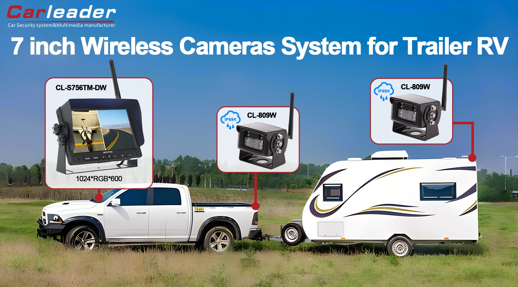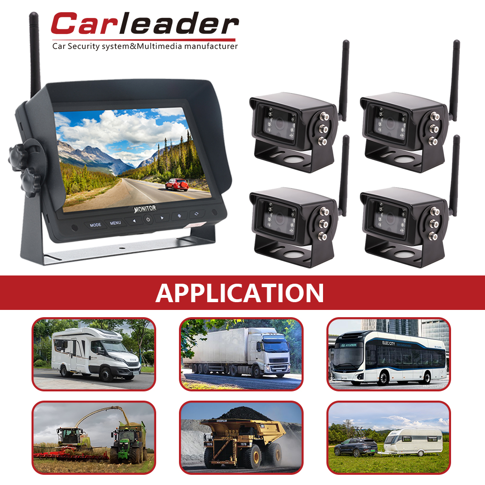 Solúbthacht: Is féidir Córas Ceamara Taispeána Scoilte Carleader 7 Inch 2.4G Digiteach Gan Sreang 2CH a úsáid ar éagsúlacht feithiclí, lena n-áirítear RVanna, busanna, trucailí, leantóirí, etc.