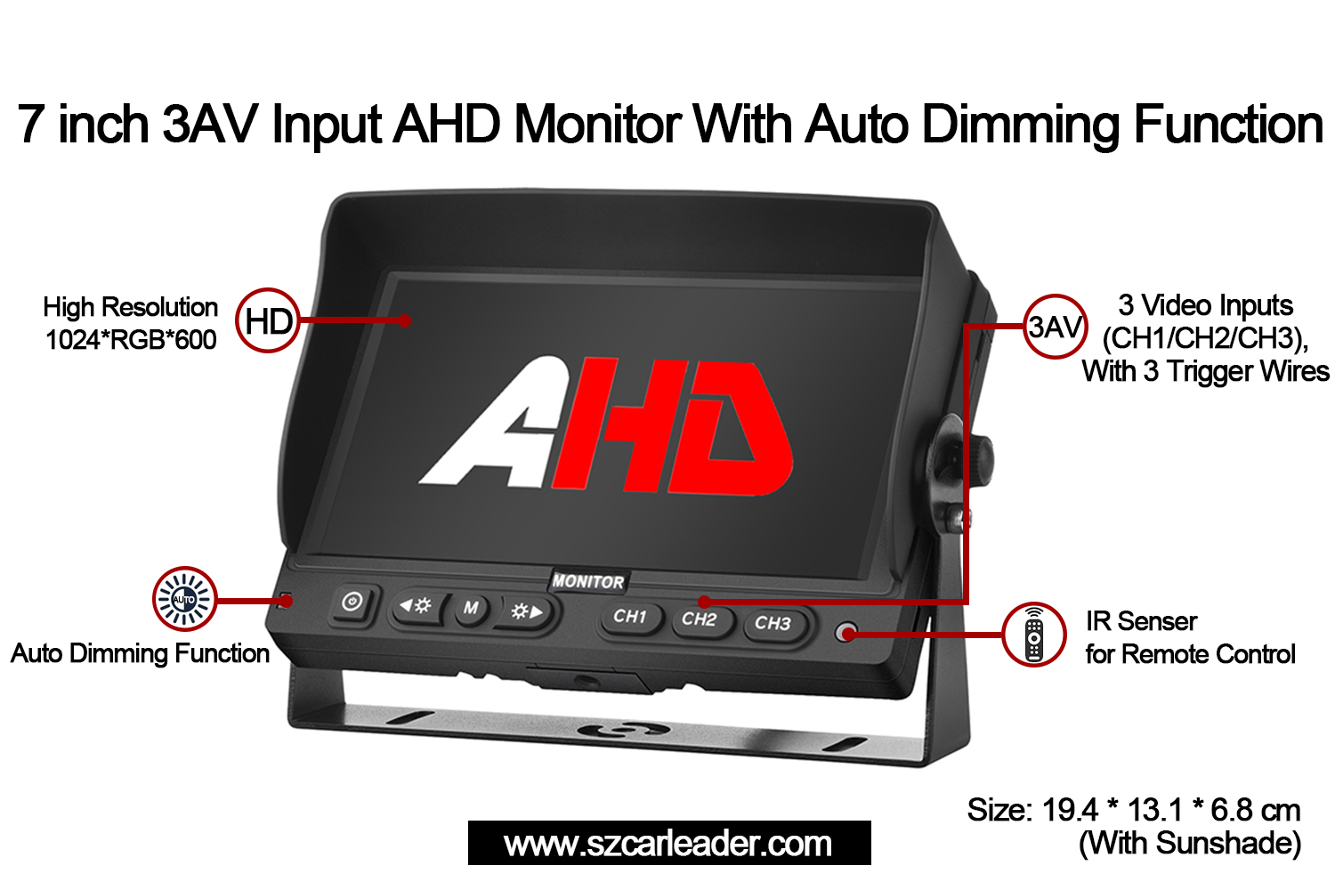 Foirfe do bhainistiú cabhlaigh, monatóireacht slándála, nó úsáid thionsclaíoch, CarleaderMonatóir Cúltaca Feithicle Ionchuir 7 Inch 3CH AHDnascann sé iontaofacht, solúbthacht, agus nuálaíocht úsáideora-lárnach i bhfoirm dhlúth.
