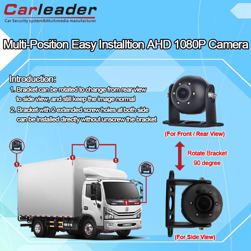 CarleaderAHD Feithicle Dualgas Trom Tosaigh / Taobh / Cúil Amharc Ceamara le lúibín a shuiteáil poll ag an suas, síos, ar dheis, ar chlé, a cheadaíonn ceamara a choigeartú an lúibín ceamara a d'oirfeadh seasamh ceamara éagsúla, mar shampla tosaigh, taobh agus radharc cúil, a dhéanamh ceamara seo níos comhoiriúnach do chóras faireachais sábháilteachta feithicle.