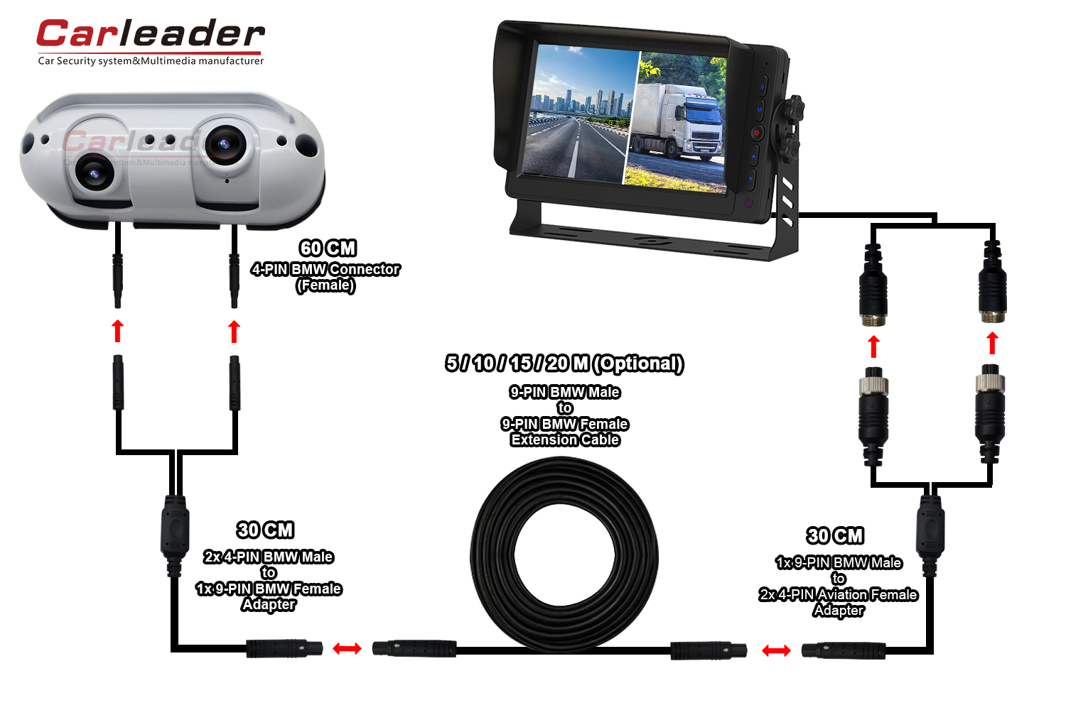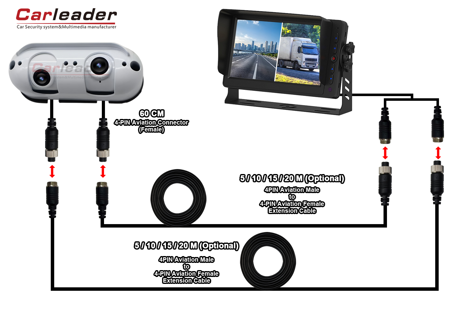Tairgfidh Carleader dhá réiteach sreangaithe dhifriúla le haghaidh Ceamara Amharc Cúil Dual Lionsa Dual Lionsa Amharc Cúil Trom Starlight, a d’oirfeadh do riachtanais sreangaithe éagsúla: