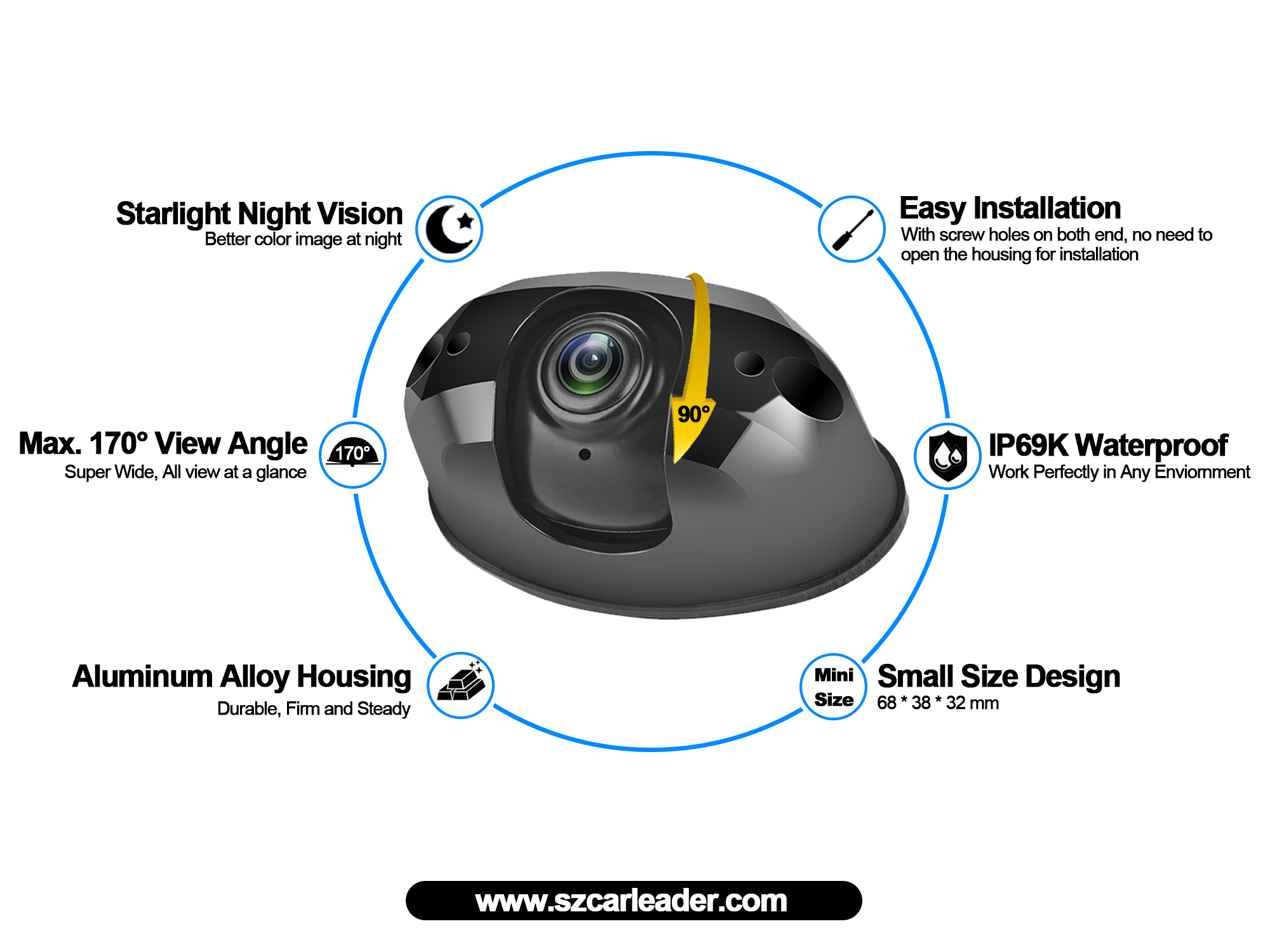 Soláthraíonn Ceamara Cúltaca Dleacht Trom Uiscedhíonach AHD 170 Céim Leathan le pictiúr soiléir fíor-ama don tiománaí le linn an phróisis tiomána. A Uillinn super-mhór suas le 170 °, níos mó don tiománaí chun raon leathan monatóireachta a sholáthar, ionas gur féidir leis an tiománaí monatóireacht a dhéanamh ar an timpeallacht timpeall na feithicle gan aon spotaí dalla