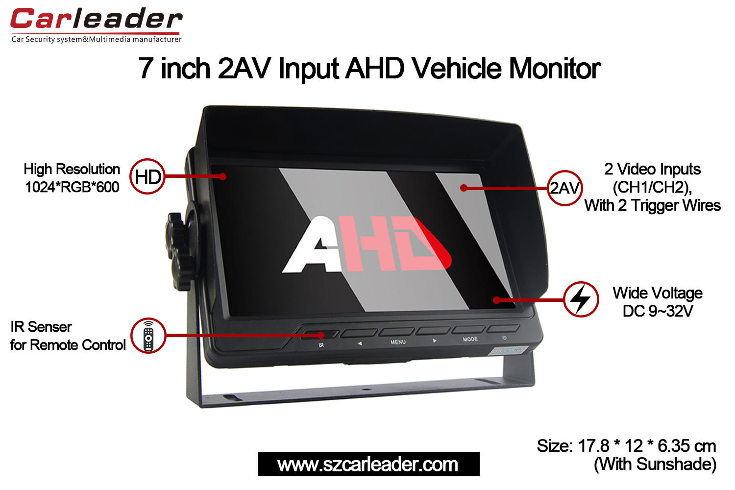 Monatóir Feithicle Ionchur Carleader 7 Inch AHD 2CHcomhcheanglaíonn sé iontaofacht, soiléireacht agus solúbthacht i ndearadh dlúth agus marthanach, rud a fhágann gur rogha iontach é do riachtanais mhonatóireachta feithicle gairmiúla agus pearsanta.
