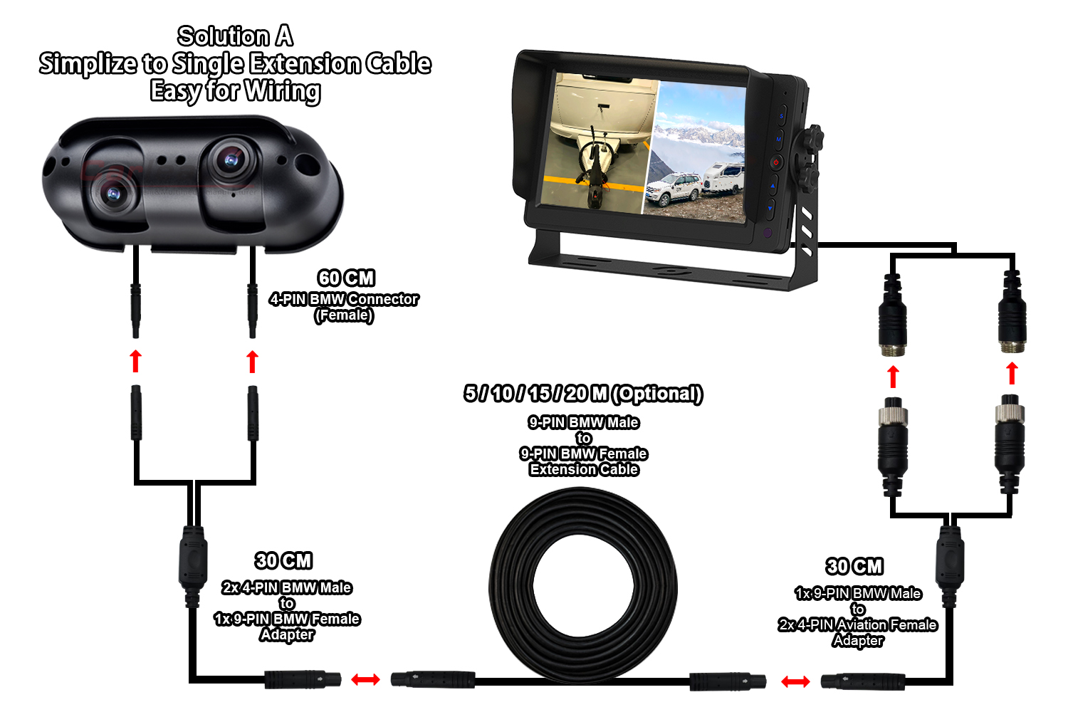 Ní úsáideann an chéad réiteach ach cábla síneadh amháin (cónascaire 9-PIN BMW), cábla scoilte 1 go 2 don dá cheann chun ceamara agus monatóireacht a nascadh. Mar gheall ar an réiteach seo ach amháin dúinn ar chábla síneadh, a dhéanann an próiseas sreangú níos éasca agus níos áisiúla.