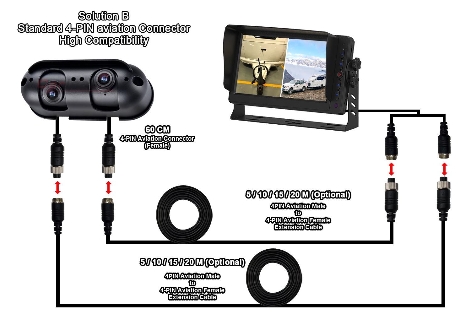 Cuirfidh Carleader dhá réiteach sreangaithe éagsúla ar fáil le haghaidh AHD Starlight Dual Lions Rear View Camera oiriúnach Do RV Motorhome, chun freastal ar riachtanais sreangaithe éagsúla: