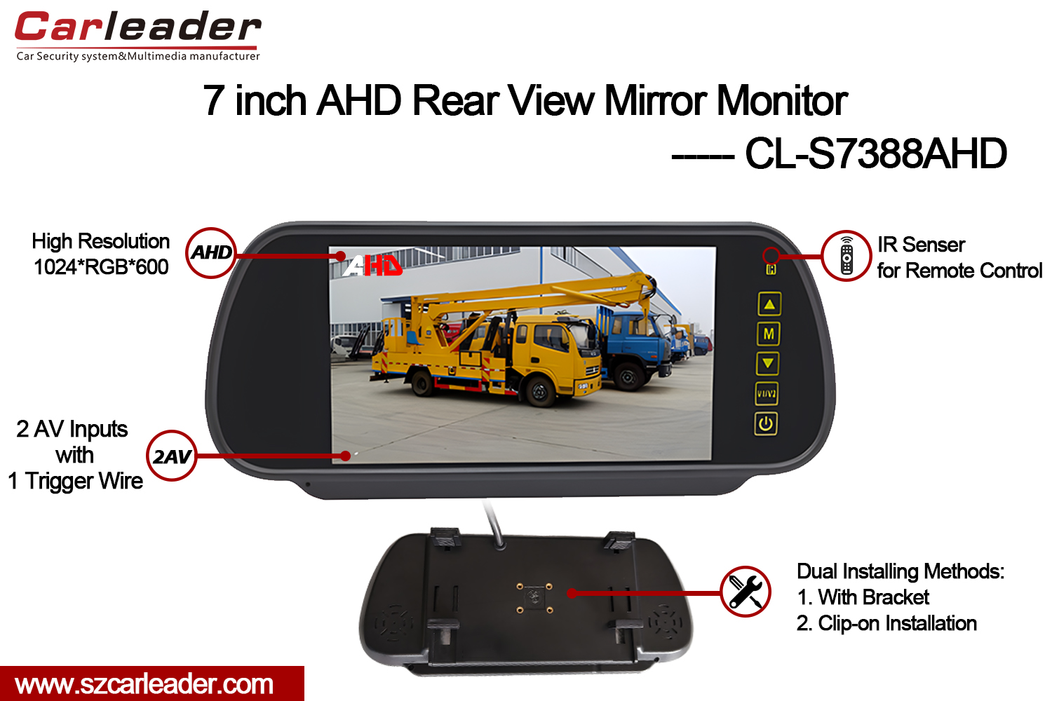 CarleaderMonatóir AHD Scáthán Amharc Cúil TFT LCD 7 OrlachIs monatóir AHD scátháin charr 7-orlach ardfheidhmíochta é atá deartha chun soiléireacht agus solúbthacht eisceachtúil a sholáthar do chórais monatóireachta feithiclí nua-aimseartha. Trí ardghnéithe a chomhcheangal le dearadh atá éasca le húsáid, cinntíonn an monatóir seo feidhmíocht iontaofa i gcoinníollacha tiomána éagsúla.